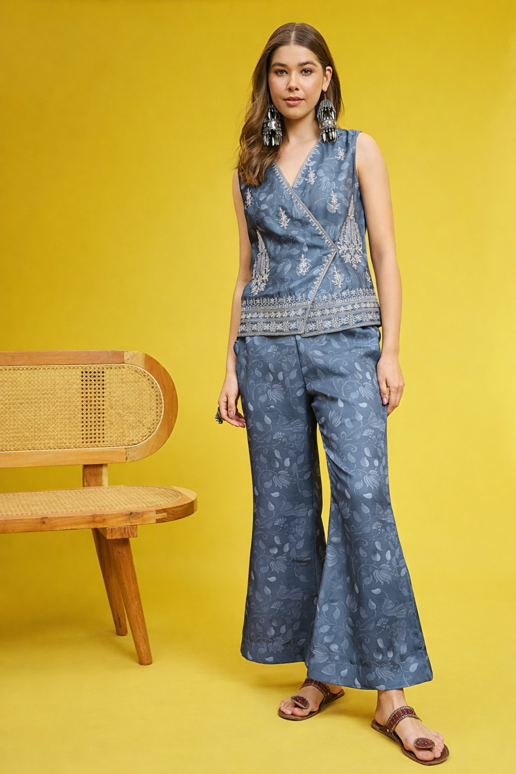 Elevate your festive wardrobe with this stunning blue ensemble featuring a printed satin linen top adorned with intricate embellished embroidery. The luxurious fabric drapes beautifully, while the detailed embroidery adds an elegant touch perfect for celebrations and special occasions. Paired with comfortable palazzos, this coordinated set offers effortless style and sophistication. Ideal for weddings, festivals, and gatherings where you want to make a graceful impression.