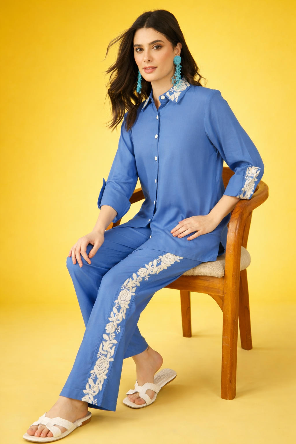 Elevate your summer wardrobe with these stunning blue viscose rayon co-ords, perfect for both casual gatherings and festive celebrations. The intricate threadwork embroidery adds an elegant touch, creating a sophisticated silhouette that transitions seamlessly from day to evening wear. Crafted from breathable viscose rayon fabric, these co-ords offer comfort and style for warm-weather occasions. Ideal for parties, weddings, and special events where you want to make a graceful impression.