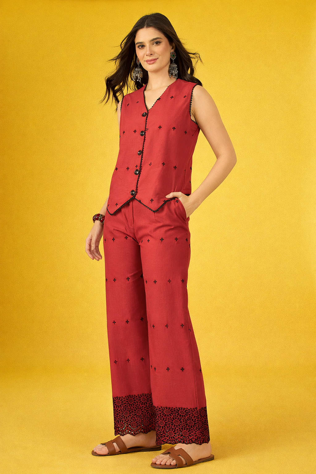 Elevate your everyday style with this stunning maroon schiffli co-ord set! Crafted from pure cotton, this waistcoat ensemble combines comfort with contemporary flair. The intricate schiffli embroidery adds a touch of artisanal charm, while the coordinated pieces make getting dressed effortless.
